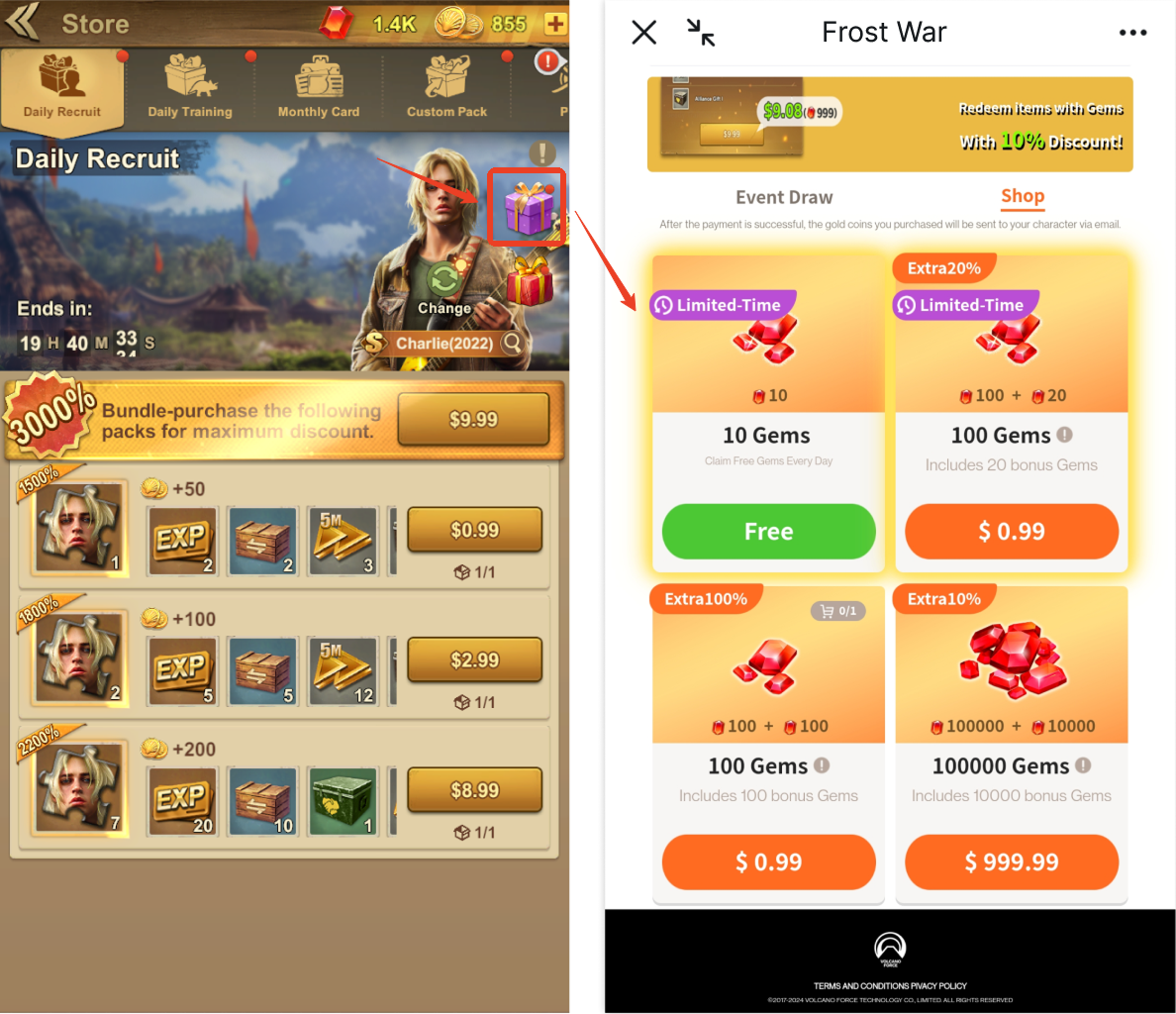 · Gems can substitute currency for all in-game recharge events. For example, spending Gold to redeem items during the a recharge event will count towards the recharge points in the event.